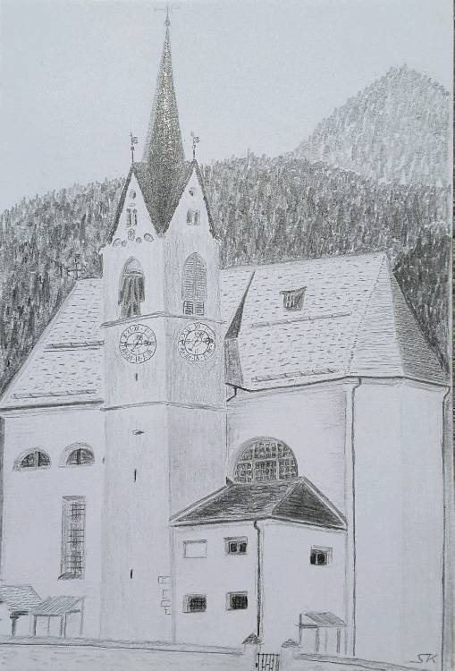 Die nächste fertiggestellte Zeichnung ist direkt aus Antholz Mittertal. Gegenüber der Kirche gönnten wir uns ein Bierchen. Dabei zeichnete ich schon einmal die Umrisse. So nach und nach kam dann der Rest dazu.