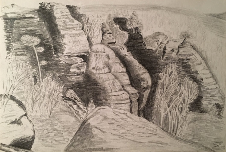 Letzte Woche habe ich auch die dritte Zeichnung von dort fertiggestellt. Begonnen hatte ich sie auf den Schrammsteinen. Ihr seht hier einen Ausblick vom Gipfelweg aus.