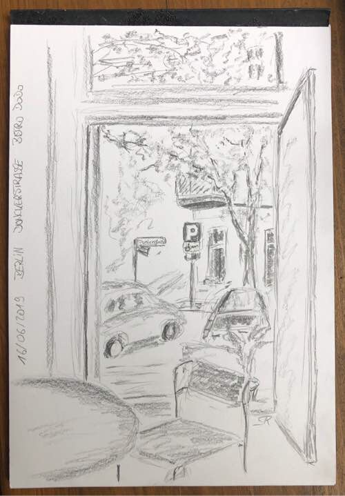 Um den Hunger zu stillen, setzten wir uns zur Mittagszeit ins Café Dodo. Zum Glück wurde gerade der Platz am Fenster frei. In der Wartezeit auf das sehr leckere Essen entstand die folgende Zeichnung.