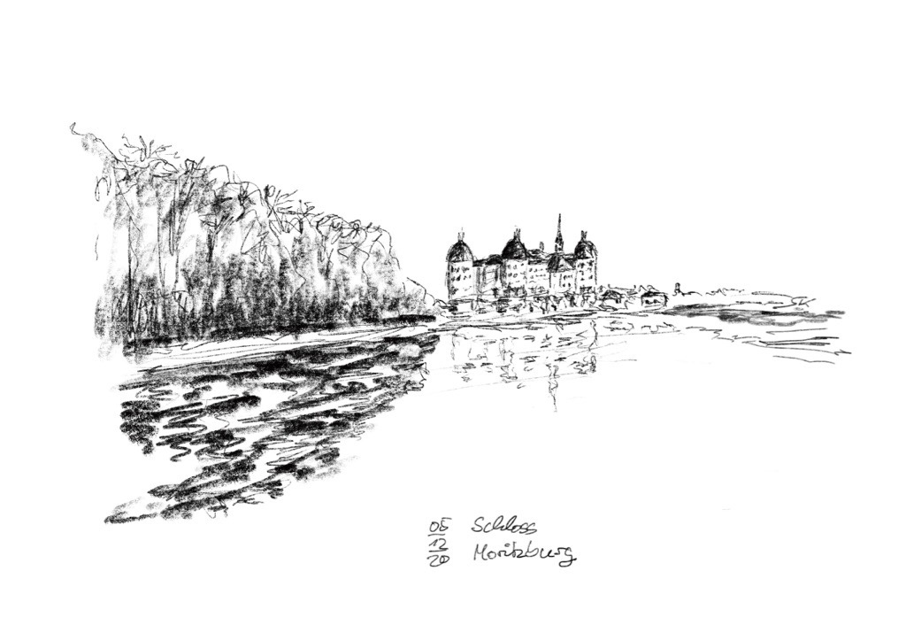Natürlich spazierten wir ums Schloss. Dieses Mal wählten wir bei der Runde um den Schlossteich eine andere Route als die Male davor. Es boten sich auch hier schöne Ansichten. Die angefrorene Wasseroberfläche spiegelte interessant das Schloss. Das habe ich mal versucht, mit einer Zeichnung einzufangen.