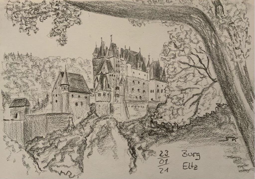 Dabei stieß ich auf die Burg Eltz. Die hatte es bis heute nicht ins Skizzenbuch geschafft. Also wurde das Papier glatt gestrichen, der Stift gespitzt und es ging los.