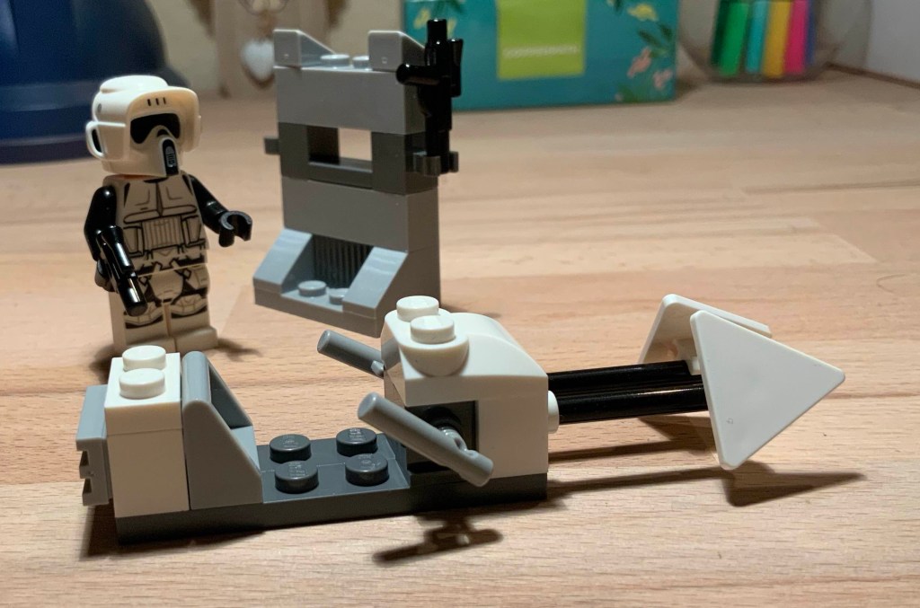 Der Scout-Trooper kommt mit Waffenregal und Speederbike. Grogu ist noch nicht zu sehen. Eine Tasche mit dem Kleinen hat der Trooper jedenfalls nicht dabei.