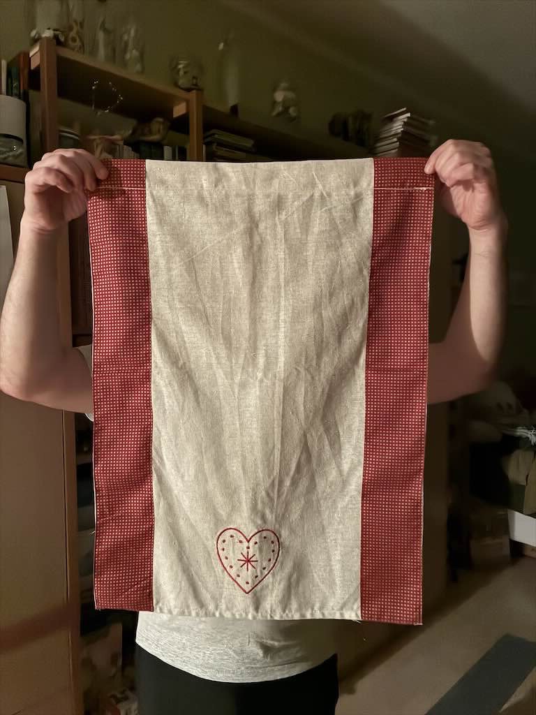 Die langweiligen weißen Standardvorhänge wollten wir von Anfang an ersetzen. Lange suchten wir nach einem passenden Stoff. Meine Frau fand dann einen Tischläufer. Dieser passte wie die Faust aufs Auge. Wir mussten ihn nur genau in der Mitte durchschneiden und umnähen.