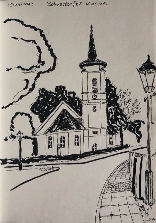 Die zweite Zeichnung zeigt die Bohnsdorfer Dorfkirche. Die hatte es ja schon einmal als Bleistiftzeichnung in die Ausstellung in der Brauerei geschafft.