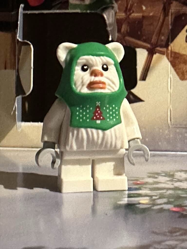 Passend zum Gleitflieger und den vielen anderen Dingen von Endor kommt hier ein Ewok. Auch er (oder sie) trägt weihnachtliche Bekleidung.