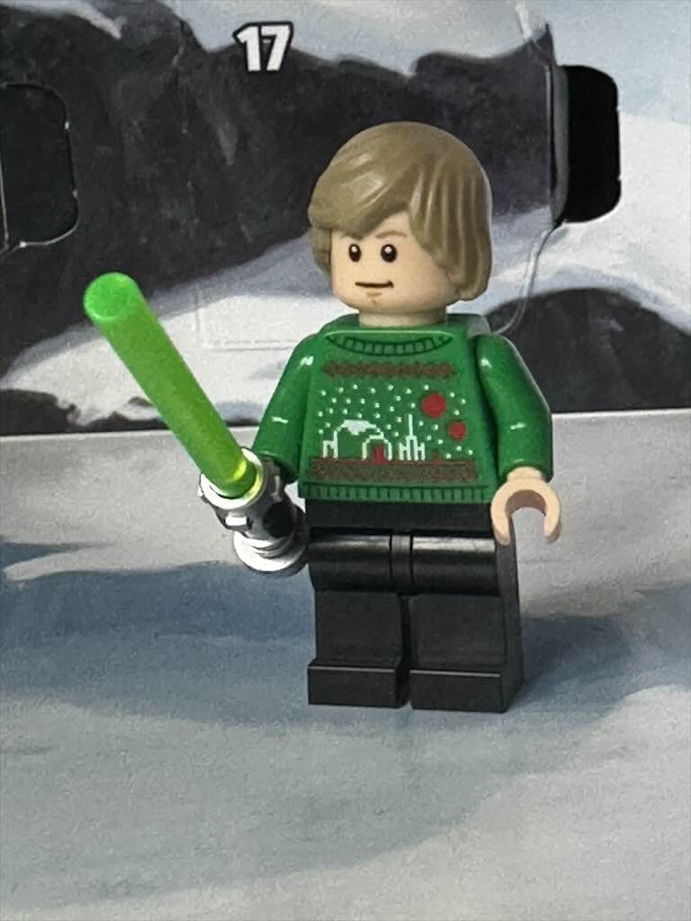 Luke hat sich, passend zu Leia, einen Weihnachtspullover angezogen. Mit seinem grünen Laserschwert kann er auch gleich für weihnachtliche Beleuchtung sorgen.