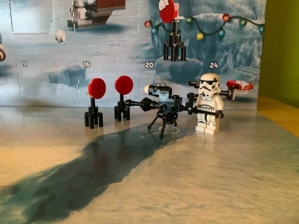 Aber die gehören auch zusammen. Am 3. war der obligatorische Storm-Trooper dabei, am 4. seine Waffe (offensichtlich ein E-Netz-Blaster als „Schneeball-Werfer“) und heute am 5. dann die Ziele.