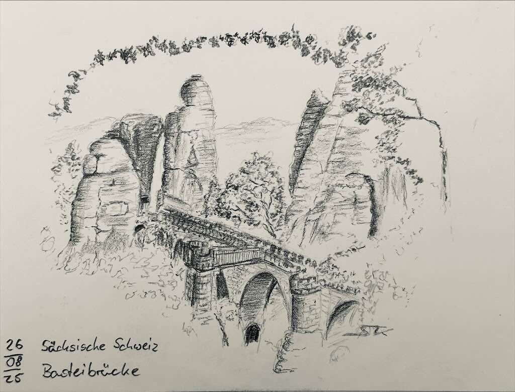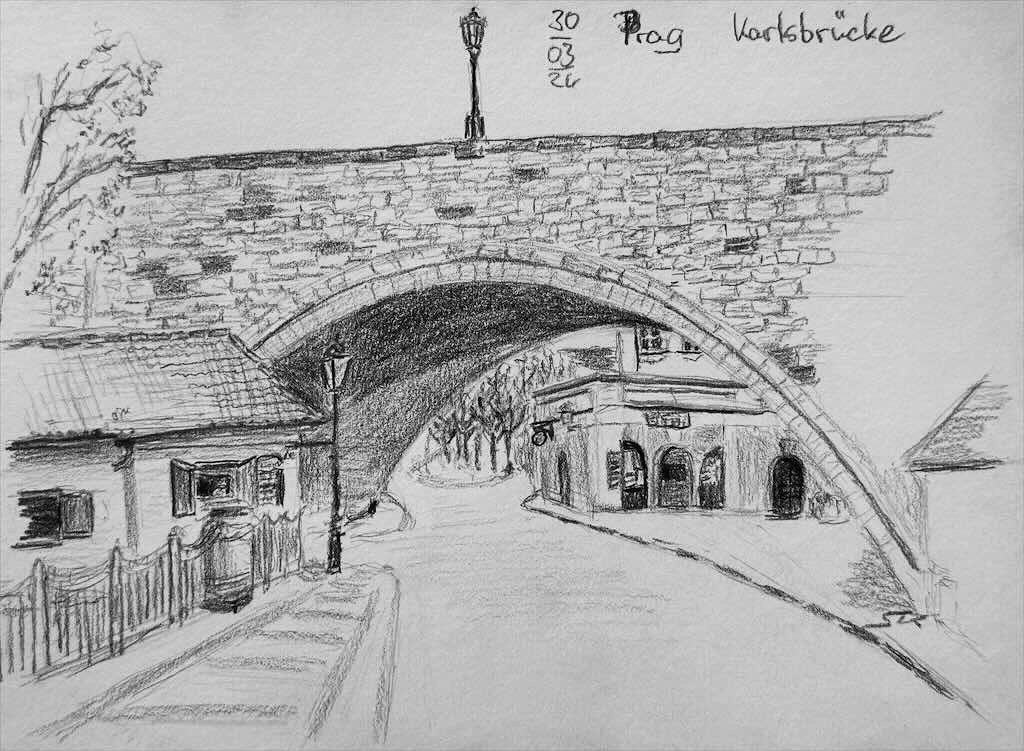 Der zeichnerische Abschluss war dann doch noch ein Torbogen. Naja, genau genommen ein Brückenbogen der Karlsbrücke.