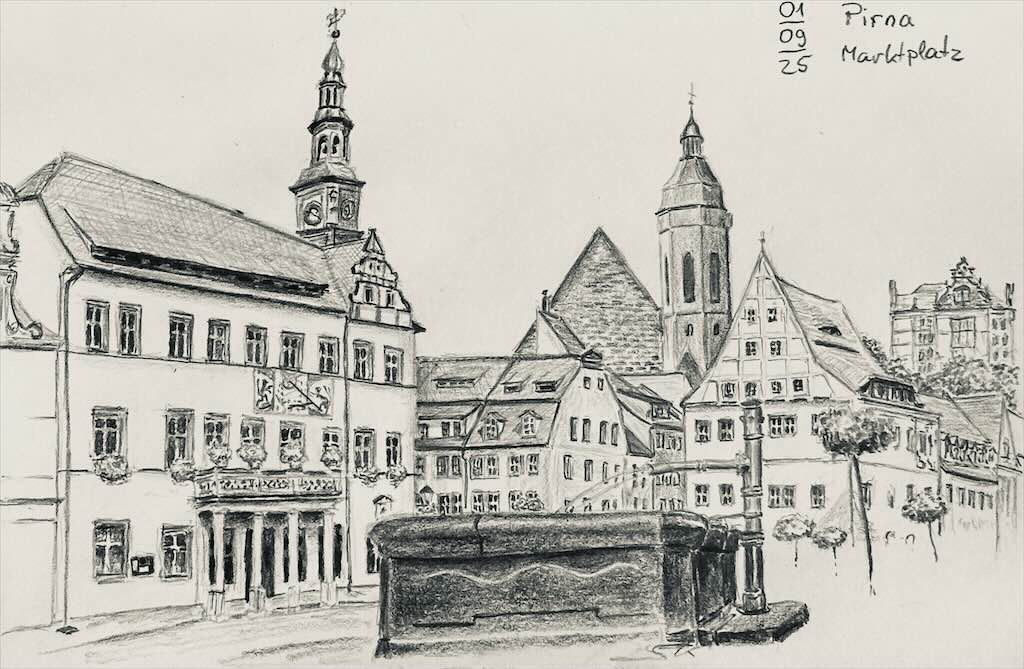 Für ein Treffen mit einem weiteren Meister seiner Zunft kam ich auch in Pirna zu spät. Bernardo Bellotto, besser bekannt unter dem Namen Canaletto, malte den Marktplatz bereits im Jahr 1768. Da im Café die obere Etage nicht geöffnet und auch sonst kein Platz mehr frei war, wählte ich eine etwas andere Perspektive. Aber alle Gebäude meiner Zeichnung sind auch in Canalettos Gemälde vorhanden.