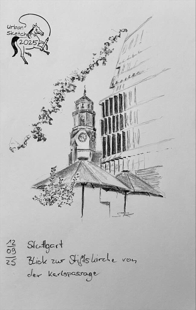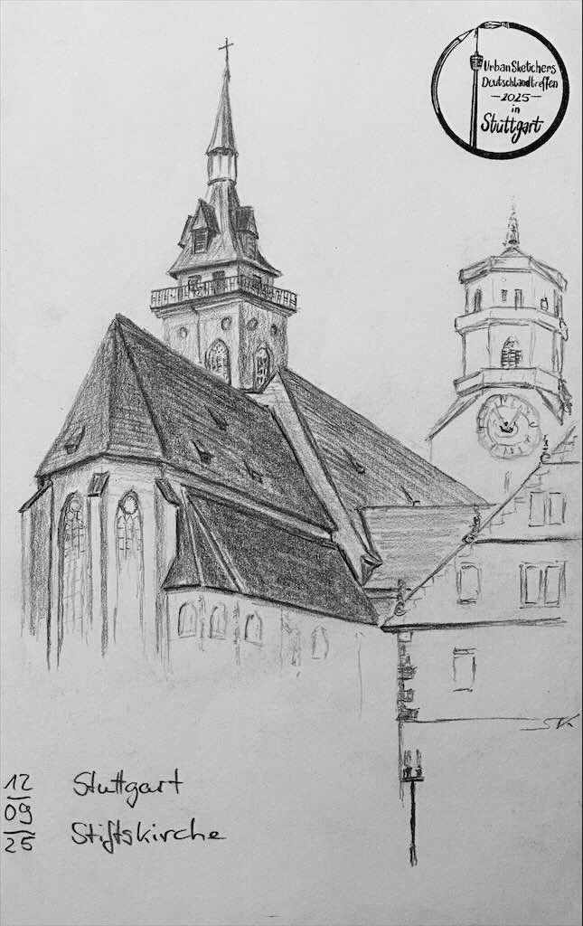 Wenn die Kirche schon Stiftskirche heißt, muss man sie auch zeichnen.Wenn Rundes auf Eckiges trifft wird es fordernd.Auf der Suche nach einem Anspitzer noch rasch gezeichnet.