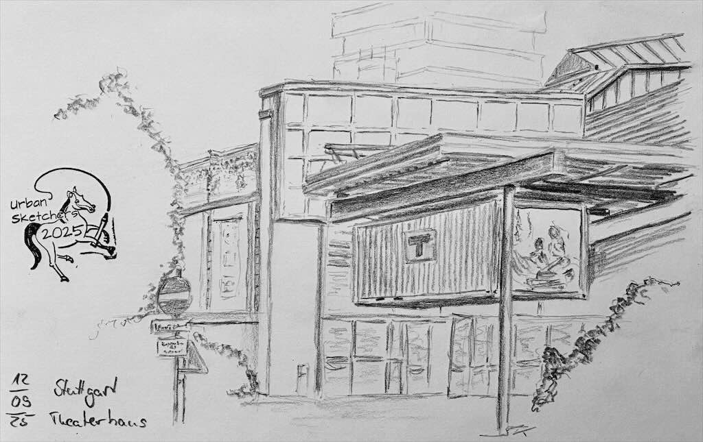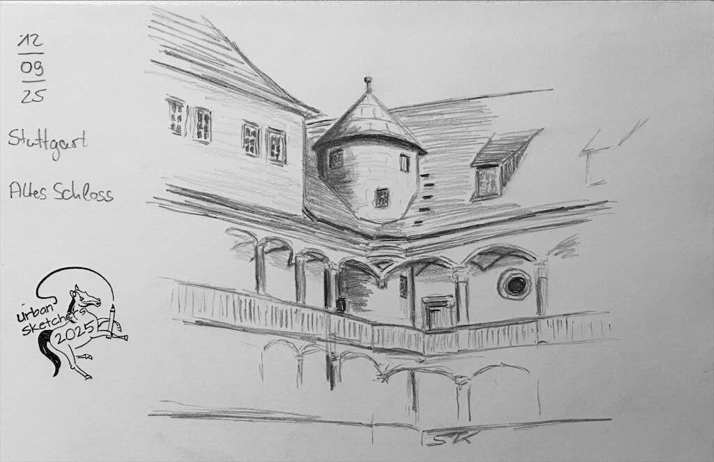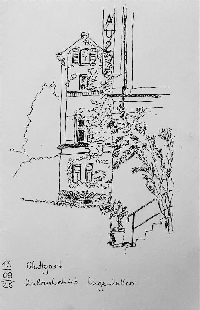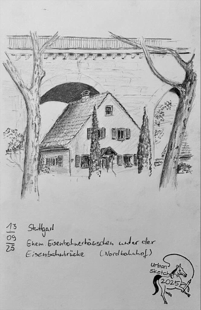 In diesem Jahr trafen sich die Urban Sketcher in Stuttgart. Das war jetzt etwas weiter weg und meine Tochter und ich reisten mit der Bahn an. Das klappte recht gut, bis 1km vorm Stuttgarter Bahnhof waren wir auch noch recht pünktlich. Dann war jedoch leider unser Gleis besetzt.