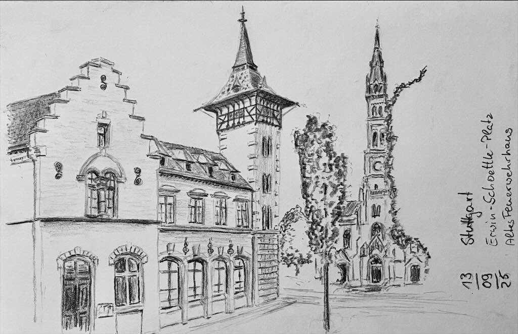 Am Nachmittag traf ich mich dann mit der nächsten Gruppe am Erwin-Schoettle-Platz. Hier überlegte ich eine Weile, ob es die Kirche oder das Feuerwehrhaus wird. Nun, es gab doch tatsächlich einen Platz, wo beide Gebäude aufs Papier passten.