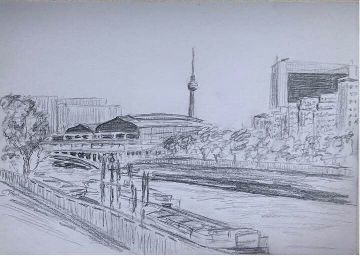 Vor 3 Jahren zeichnete ich auf dem Tablet mit Procreate den Blick aus dem Frankfurter Büro auf die Skyline der Innenstadt. Seit August haben wir ein Büro in Berlin, direkt im Hauptbahnhof mit einer herrlichen Aussicht.