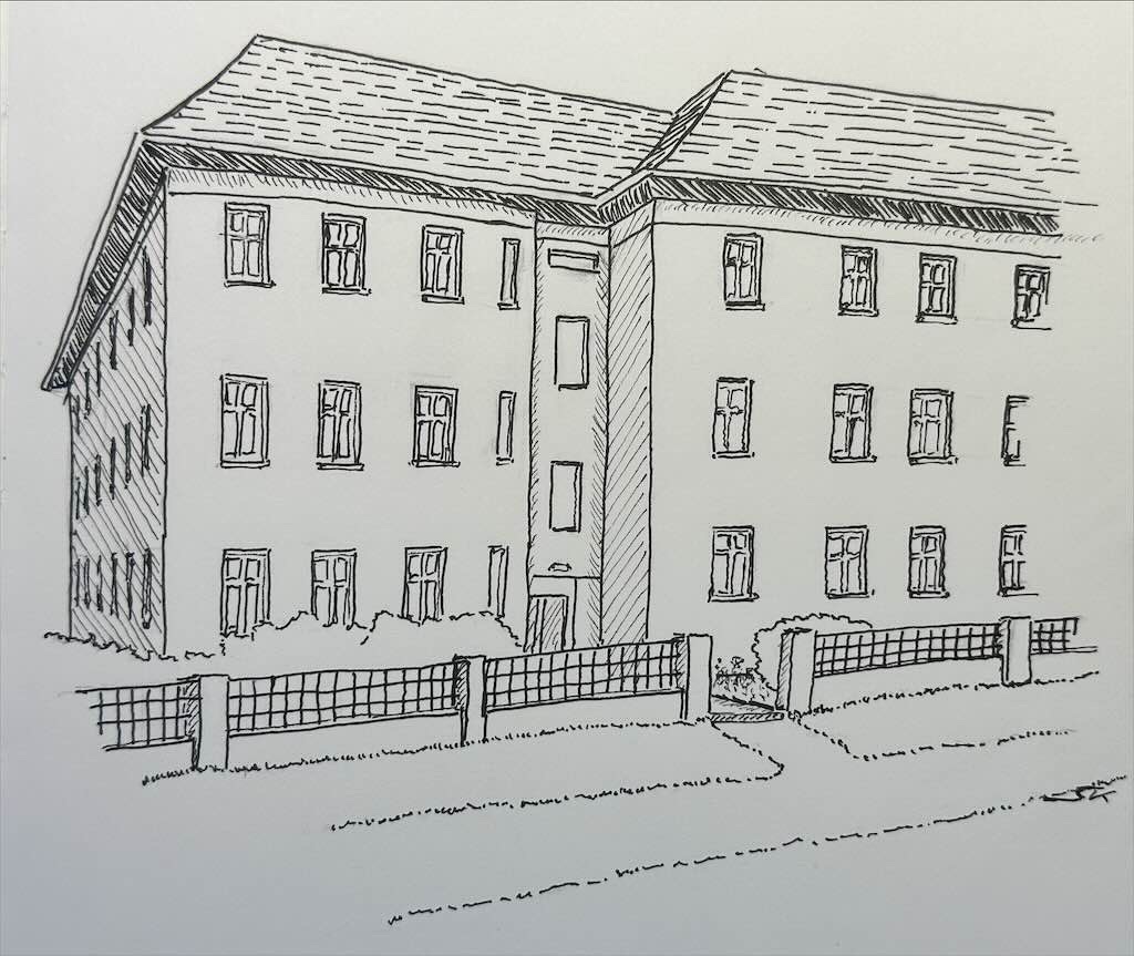 Zuerst zeichnete ich das „Halbe Haus“ an der Schlossmauer. Hier wurde ich leider vom Regen vertrieben und musste die letzten Striche im Keks-Haus bei „Kaltem Hund“ und heißer Schokolade zeichnen. Es gibt Schlimmeres! Ein wenig vom Kuchen ist in der Zeichnung auch verewigt.