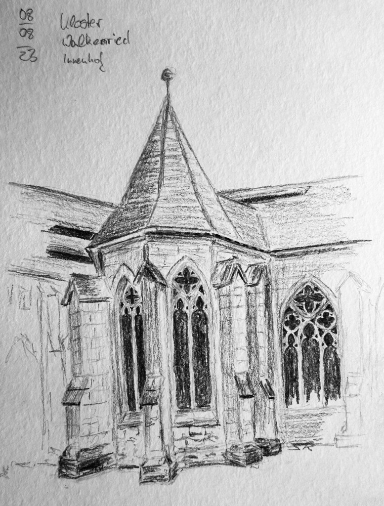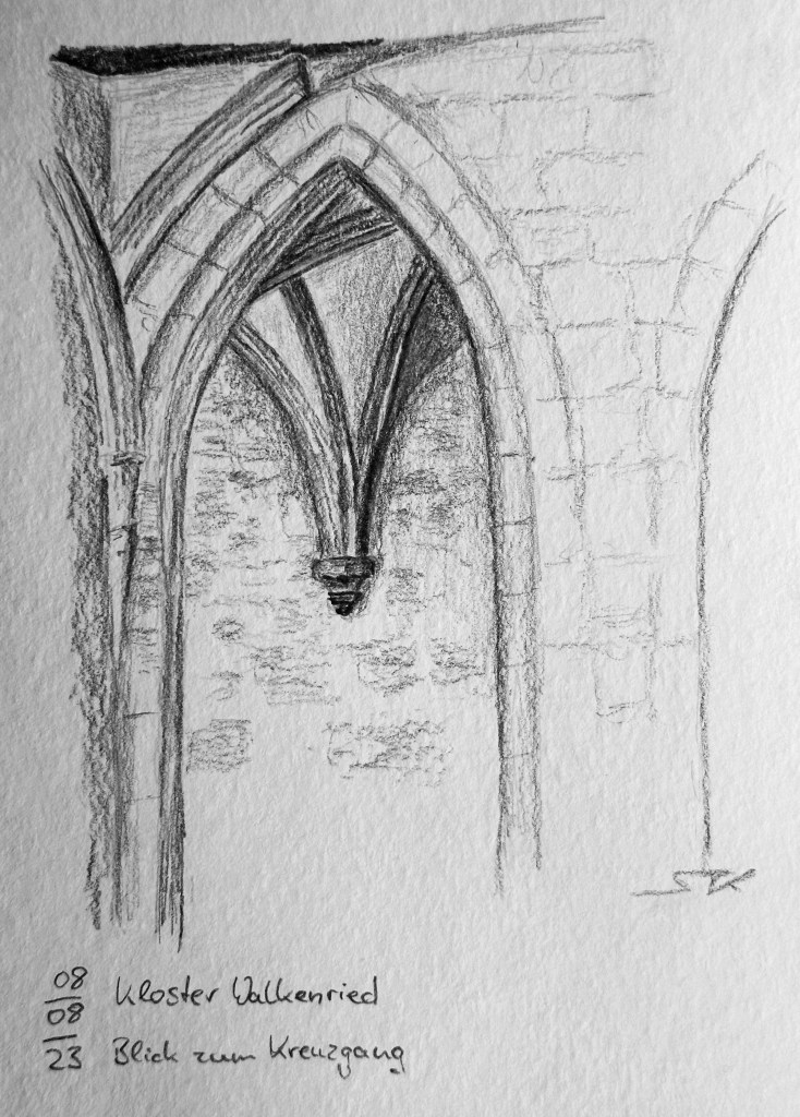 Nun, den Anfang machte die Kirche des Klosters Neuwerk. Ein schöner Blick durch die Bögen wollte aufs Papier. Das ist doch ein gutes Motiv, um an einem schnelleren Stil für mich zu arbeiten.