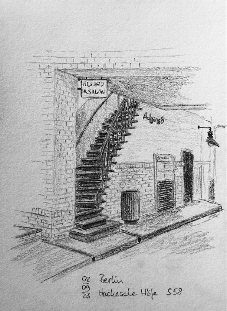 Danach machte ich mich auf den Weg zu meinem Sketchwalk S58 in den Hackeschen Höfen. Die Höfe hatte ich mir schon öfter vorgenommen, hatte aber nie ein passendes Motiv gefunden. Bei der Einführungsrunde durch unsere beiden Führerinnen, fand ich es dann. Ein Treppenaufgang, genau gegenüber einem Platz in einem Café, sollte es jetzt werden.