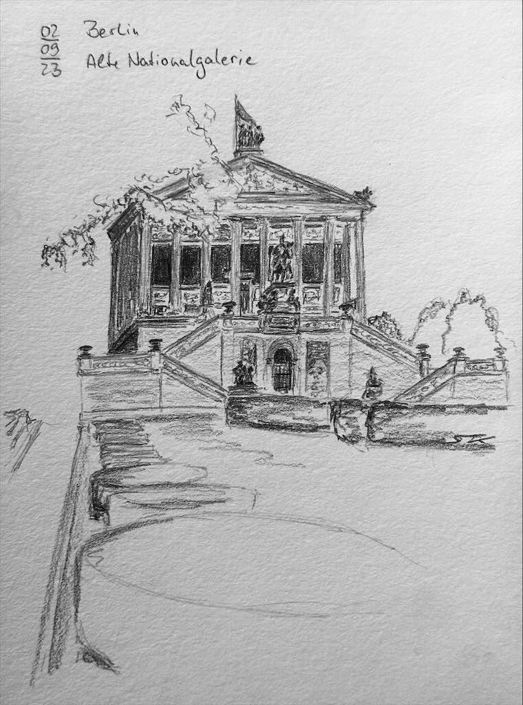 Auch hier gab es zum Abschluss ein Gruppenfoto und das gegenseitige Bestaunen der Zeichnungen. Nachdem ich alles im Rucksack verstaut hatte, war meine Gruppe wie vom Erdboden verschluckt. Auf der Suche nach ihnen landete ich vor der Alten Nationalgalerie. Auch diese hatte ich mir schon lange vorgenommen, das Wetter war gut und die Stifte noch warm, na dann los!