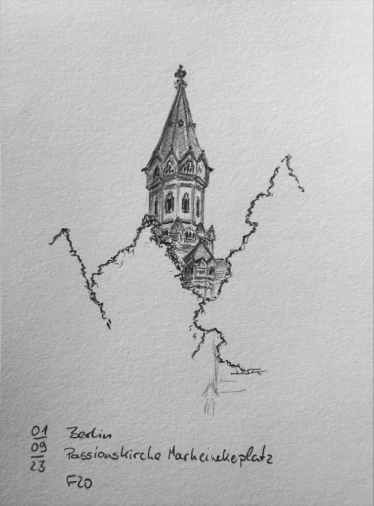 Nach einem kurzen Wiedersehen mit den anderen Zeichnern der Gruppe und dem Besprechen der gefundenen Motive ging es auch gleich weiter zum Marheinekeplatz. In der Markthalle holte ich mir nur ein Fischbrötchen und setzte mich gegenüber der Passionskirche auf eine Stufe. Hier kreuzte sich der Weg mit den Mitgliedern eines anderen Sketchwalks. Es wurden Tipps zu lohnenden Motiven gegeben und die eine oder andere Zeichnung bewundert.