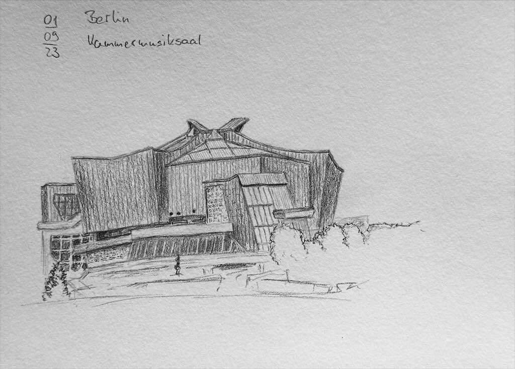Schnell gab es vor der Markthalle noch ein Gruppenfoto und los ging es zum Kulturforum zur eigentlichen Anmeldung. Dort erhielt jeder einen Anstecker und ein Informationsheft zur Veranstaltung. Zwischen Anmeldung und der Eröffnung war dann noch etwas Zeit, sich zwischen all die anderen Zeichner zu setzen und den Kammermusiksaal zu zeichnen.