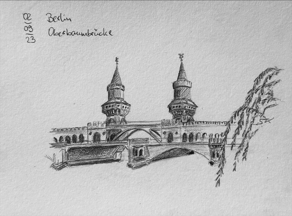 Am Samstag hatte ich meinen Sketchwalk erst am Nachmittag. Also suchte ich mir die ersten Motive auf eigene Faust. Ein Bauwerk, welches schon ewig auf der „Liste“ steht, ist die Oberbaumbrücke. Sie wurde meine erste Station. Dort traf ich auch auf eine Gruppe von Zeichnern und konnte ihnen kurz über die Schulter schauen. Zum Zeichnen positionierte ich mich ein wenig abseits der Anderen.