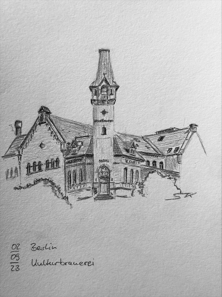 Weiter ging es nach der Einstiegszeichnung zu einem der drei sogenannten „Sketchpoints“. Das waren Anlaufpunkte für diejenigen, die grad nicht mit einer Gruppe unterwegs waren. Ich wählte die Kulturbrauerei. Unterwegs hatte ich ein sehr nettes Gespräch mit amerikanischen Touristinnen auf Fotosafari. Vor Ort gab es dann Gespräche mit bekannten und bis dahin unbekannten Zeichnern und natürlich auch von mir eine Skizze.