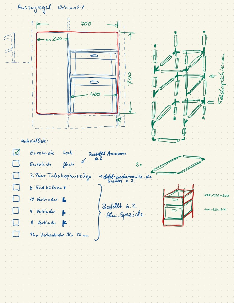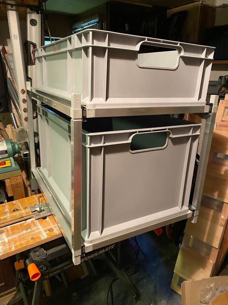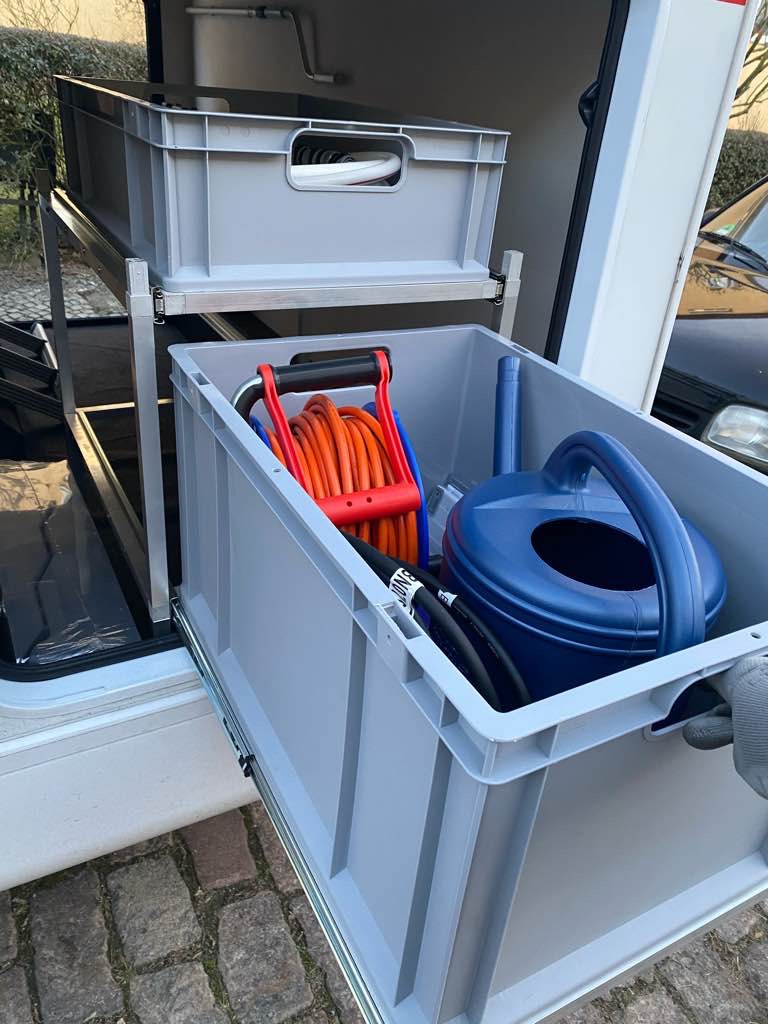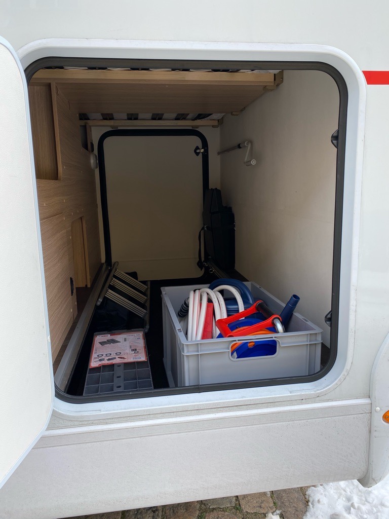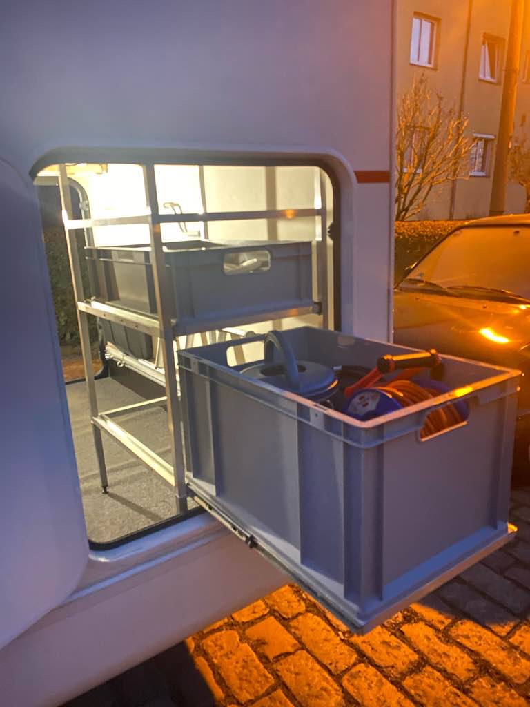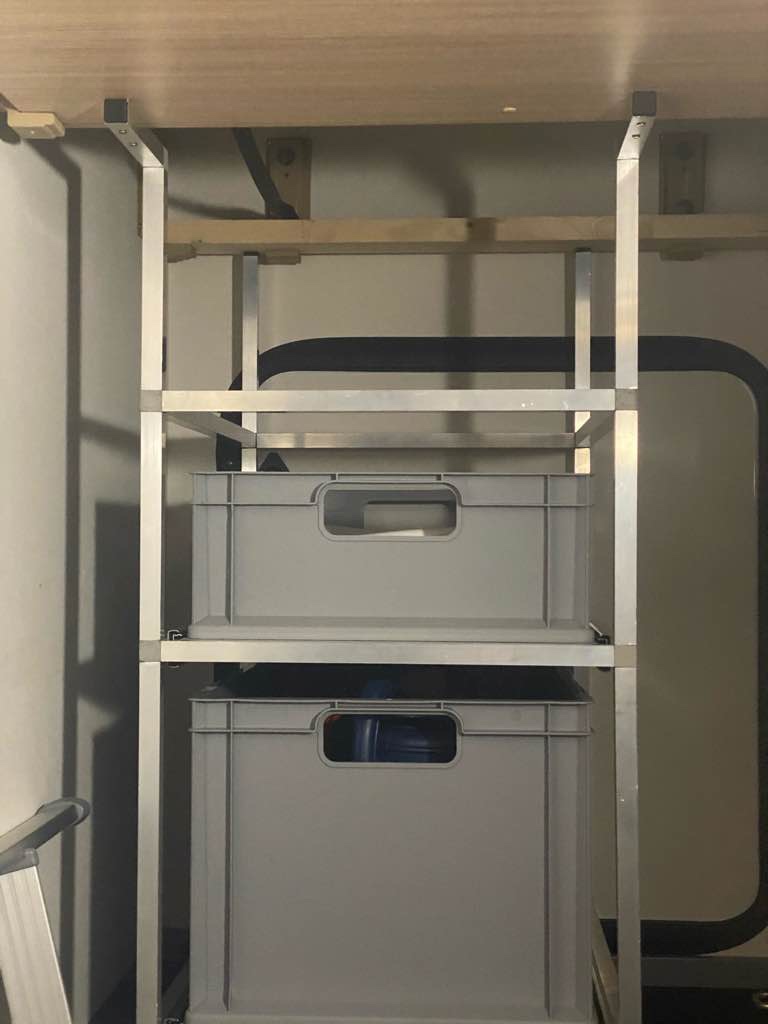 Das größte Problem war heute, das Regal an die richtige Stelle in der Heckgarage zu bugsieren. Ein paar Mal steckte die ganze Konstruktion fest. Nachdem ich mir nach oben mehr Platz geschaffen hatte, ging es.
