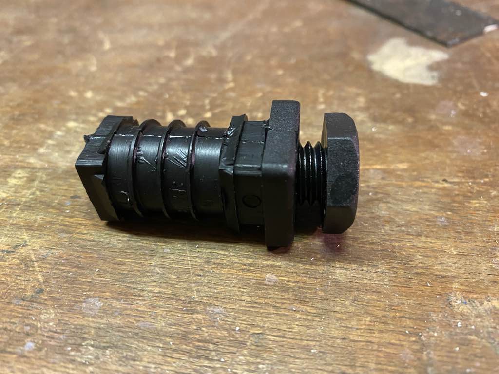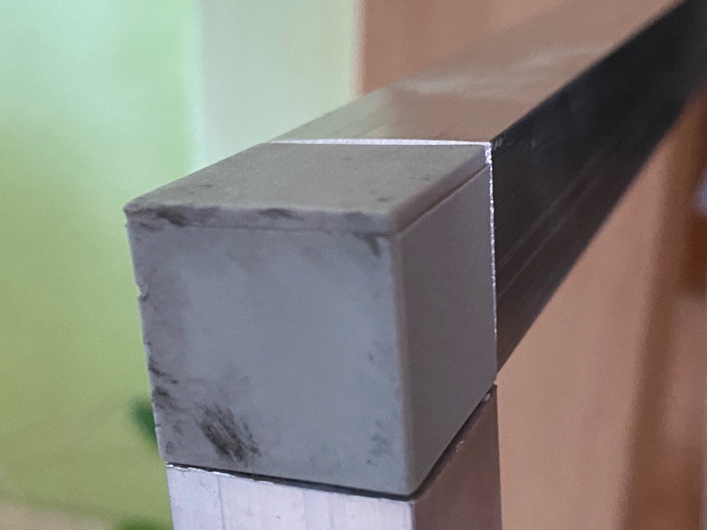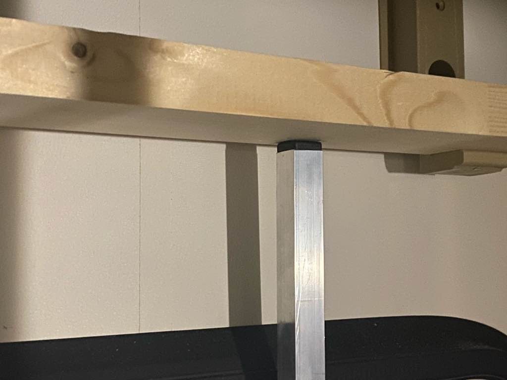 Direkt hinter der Tür hatte ich die Abschlussstopfen ans Bettgestell geschraubt. Das Vierkantrohr wurde dann aufgesteckt. Verklemmt wurde das Ganze mit den Schraubfüßen.