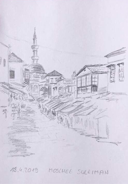 Hier seht ihr die Suleiman-Moschee. Beim Zeichnen habe ich in der Straße Socratous gesessen. Das ist die alte Hauptstraße der Altstadt. Hier reihen sich unzählige Geschäfte, Gaststätten und Cafés aneinander.