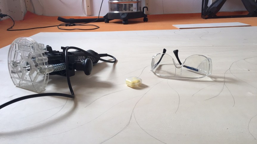 Heute durfte der Dremel zeigen, was er drauf hat. Nach dem Wurm zur Probe war nun der Baum dran. Dafür wurde der Fußboden aufgeräumt und die Sperrholzplatte mit dem vorgezeichneten Baum hingelegt. Dann nur noch Ohrstöpsel rein, Schutzbrille auf und ab ging die wilde Fahrt.