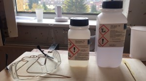 Für die Einhaltung des vorgegeben Mischungsverhältnisses von Harz und Härter (10:3) habe ich eine digitale Küchenwaage genutzt. Jeweils einen Becher, bei denen ich immer darauf geachtet habe, sie nicht zu vertauschen. Damit es sich noch leicht gießt, habe ich immer 100g Harz mit 30g Härter angesetzt. Angerührt habe ich das Ganze in einen Kunststoffbecher mit einem Glasspachtel.