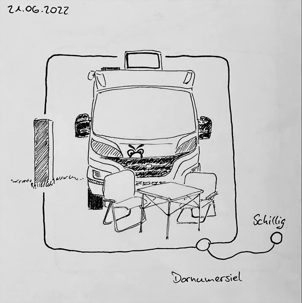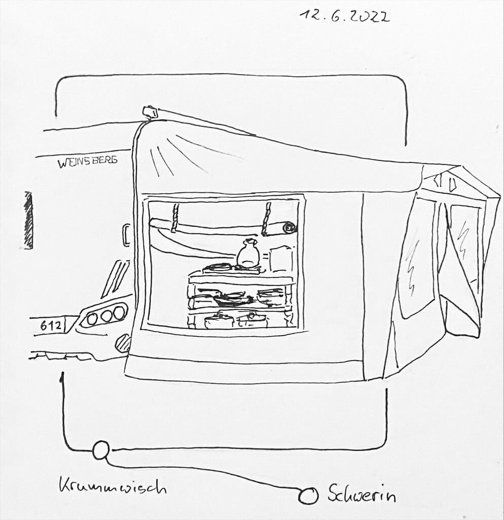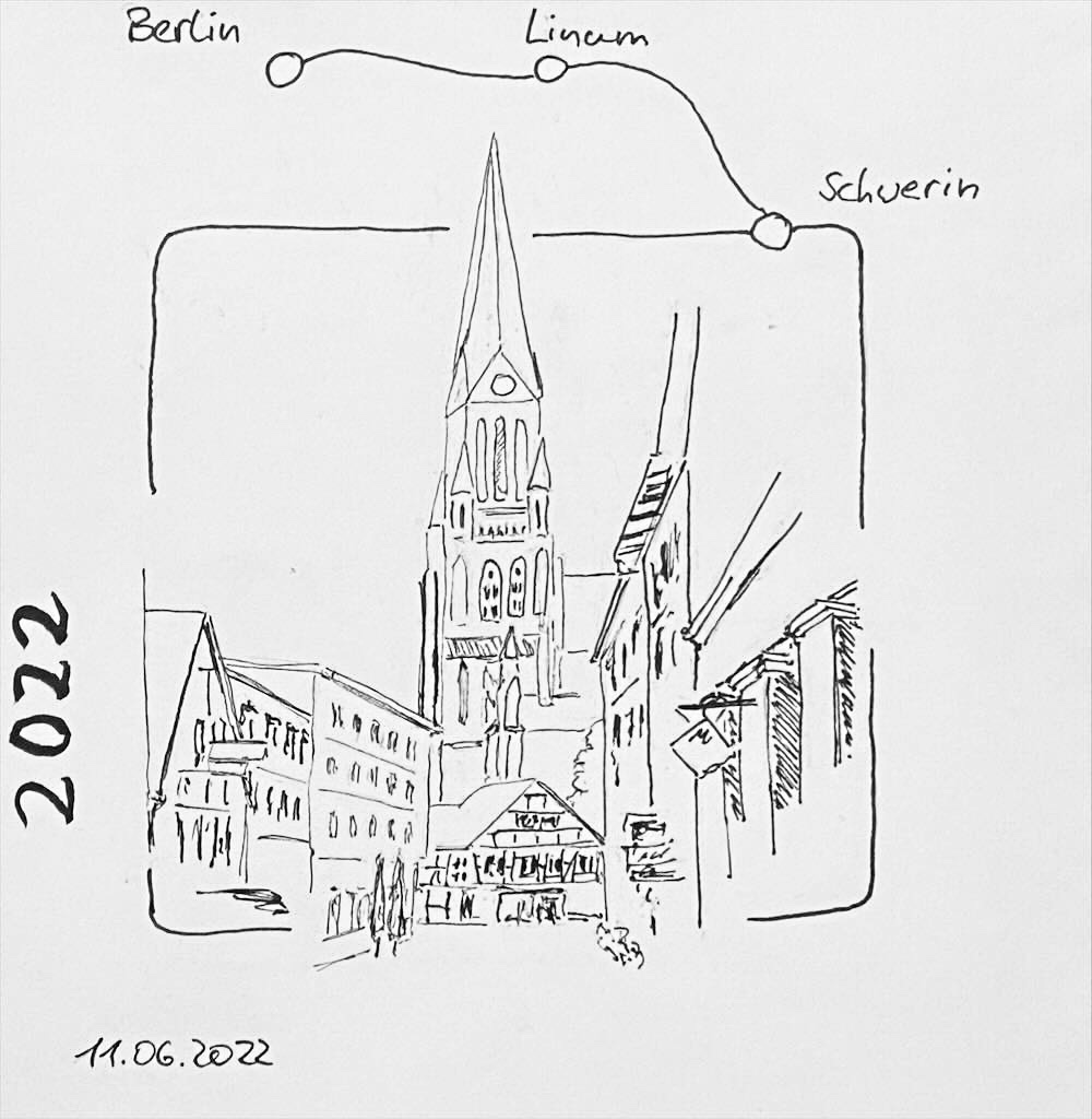 Kurz nach dem Start hielten wir schon mal in Linum zum Zeichnen, Kuchenessen und Shoppen. Weiter ging es dann nach Schwerin. Der Stellplatz gegenüber vom Schloss war schon einmal der Teuerste unserer Tour, bis auf ein Stück Parkplatz bot er auch nicht viel. Das hat man davon, wenn man die Preise erst bei der Abreise nachschaut.